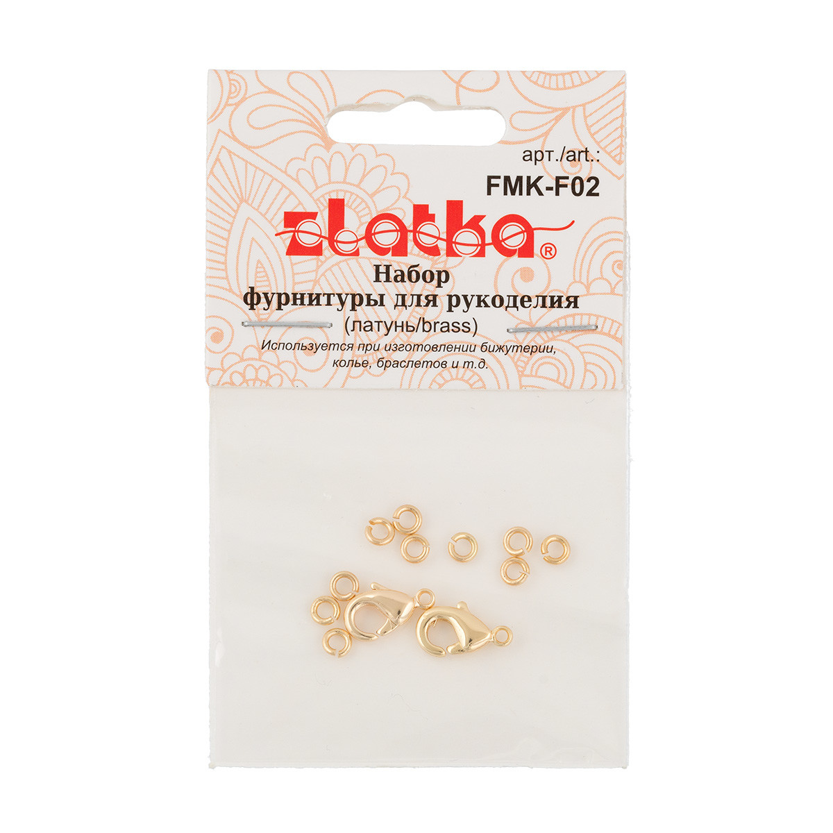Набор фурнитуры " Zlatka" FMK- F02 для создания бижутерии. Содержит в себе детали для создания украшения: кольца 10 шт диаметром 3 мм; замки 2 шт размером 10 мм; Состав: латунь. Использование качественной фурнитуры играет очень важную роль при изготовлении бижутерии. Сообщить о неточности в описании